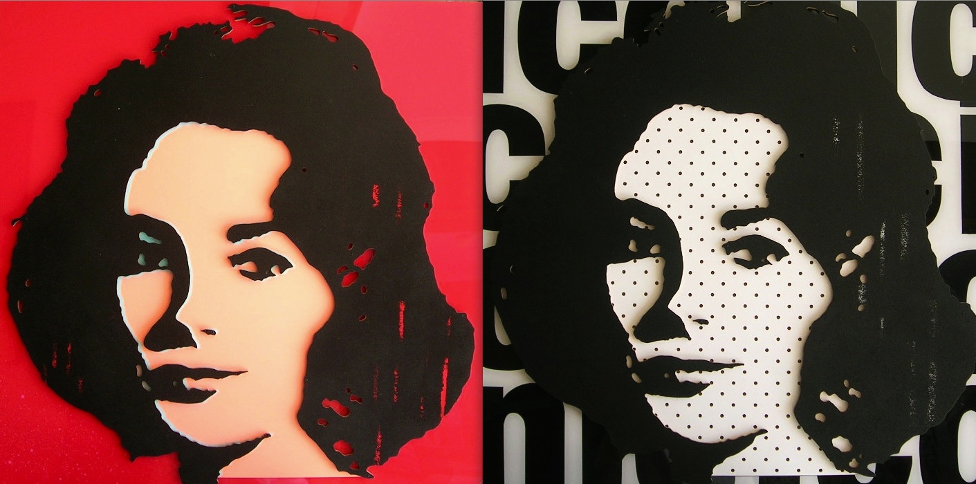 Liz Taylor, Artbydorfs spin on a Warhol classic. Perspex, masonite, epoxy, wood, enamel paint